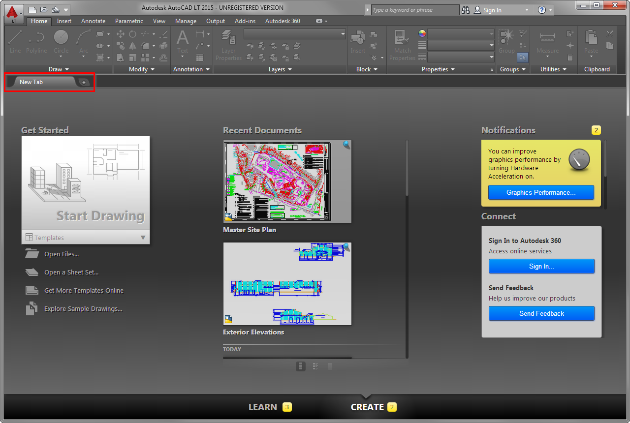 Kartica “New Tab” sadrži alate za odabir predloška crteža, otvaranje nedavnih crteža, obavijesti o novostima i važne informacije vezane uz AutoCAD te mogućnosti povezivanja sa Autodeskovim cloud uslugama i društvenim mrežama.
