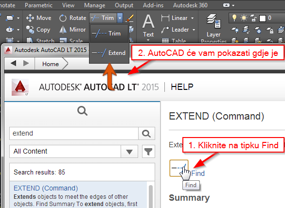Ukoliko ne možete pronaći neku naredbu, u sustavu pomoći kliknite na tipku Find i AutoCAD će vam pokazati gdje se naredba nalazi
